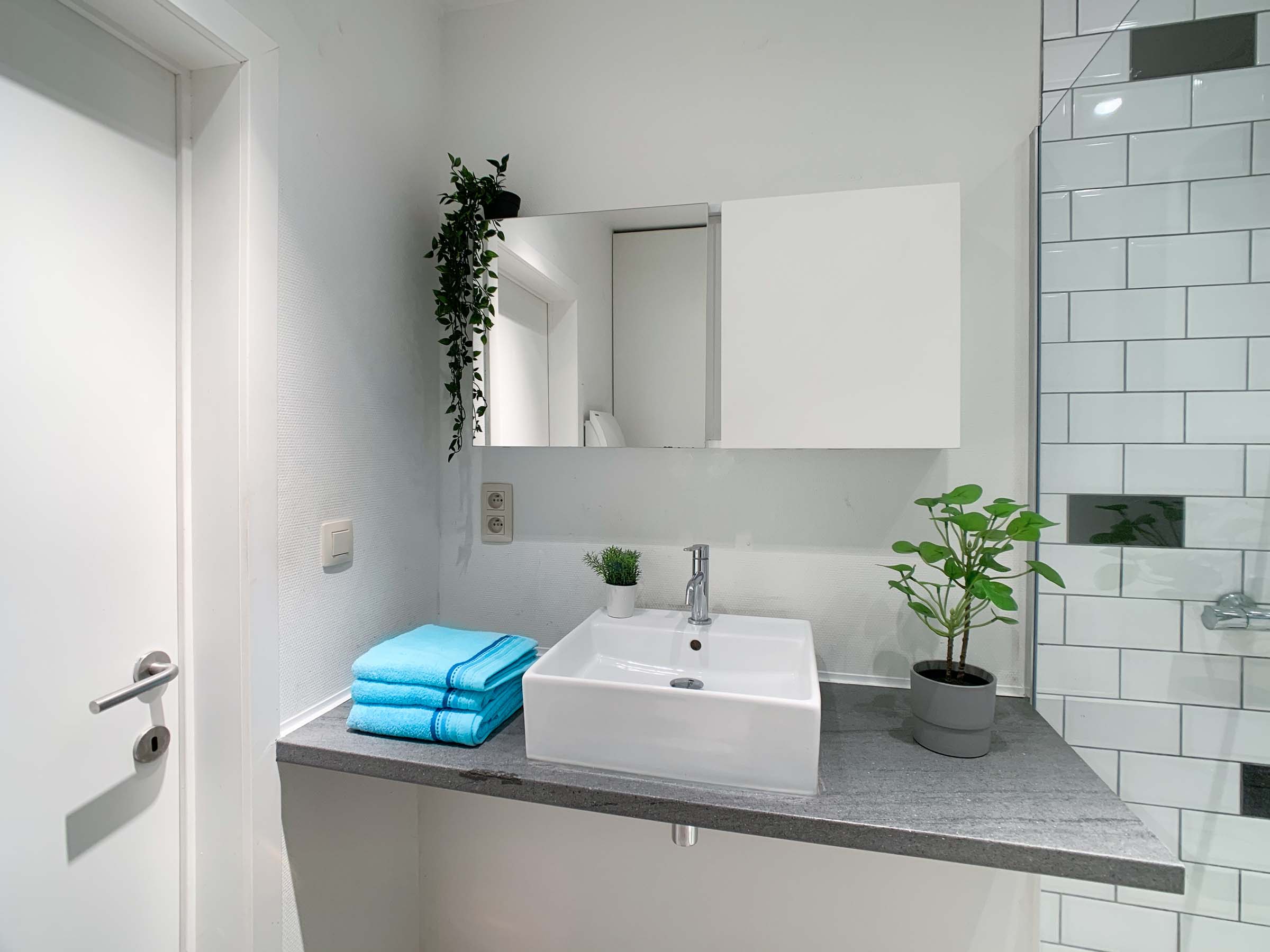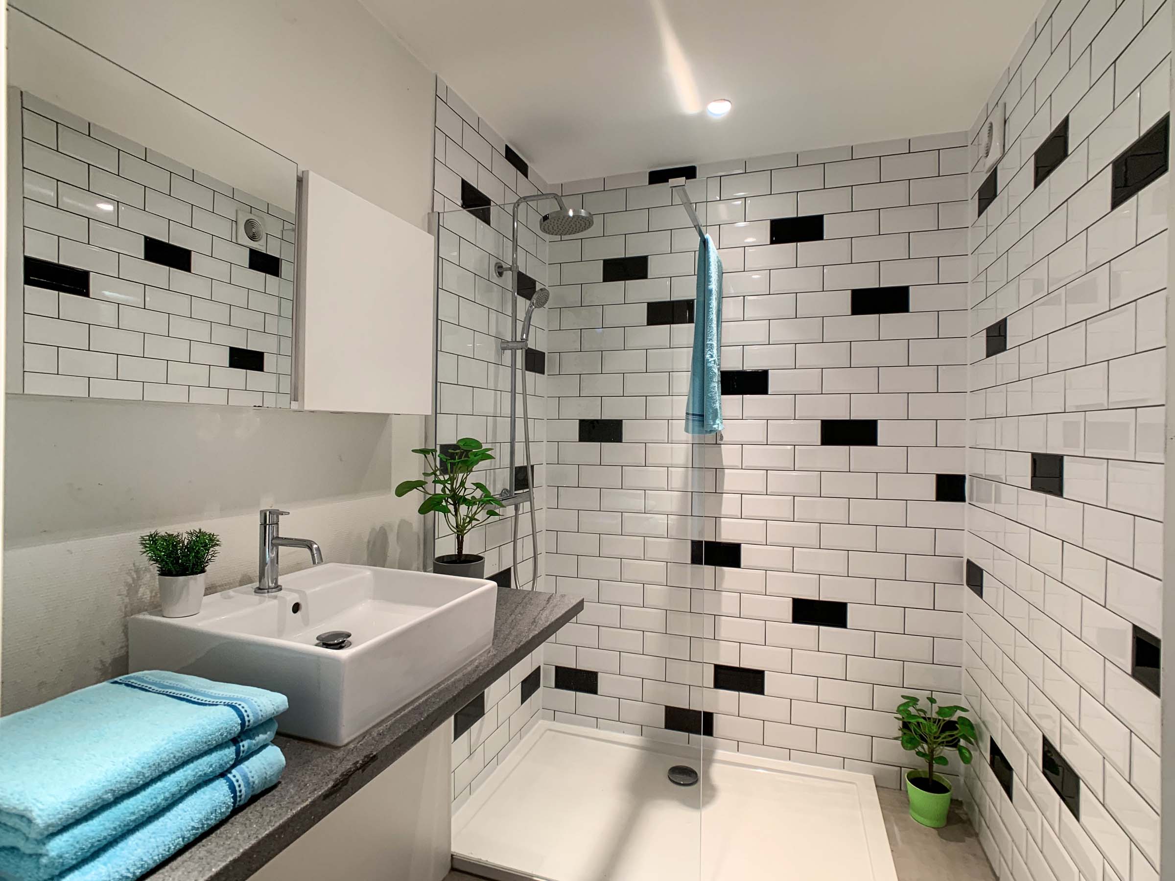 -Volledig nieuwe badkamer: inloopdouche, vloeren en wanden volledig betegeld, enkele lavabo, badkamermeubel, hangtoilet, nieuwe kranen, spots