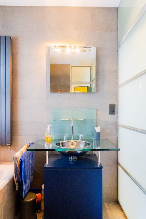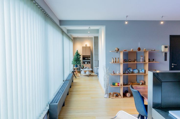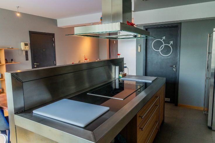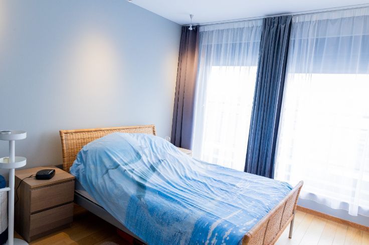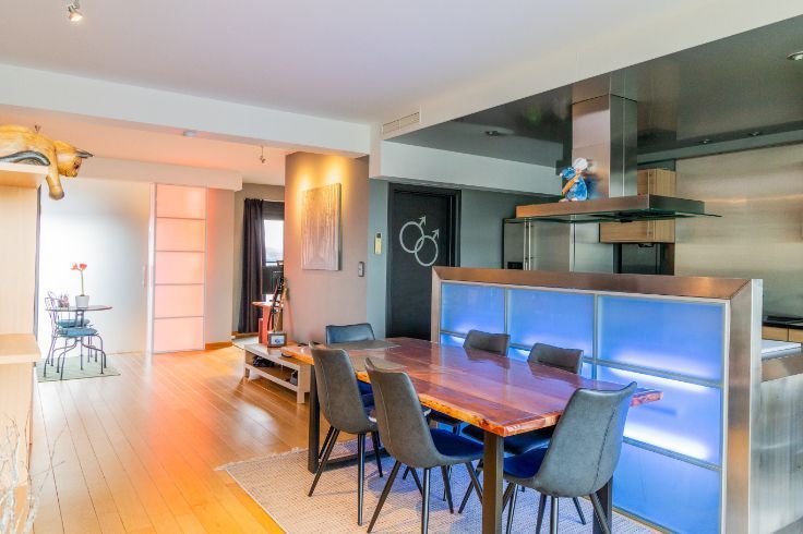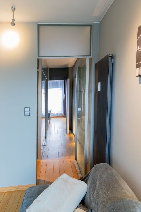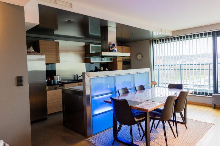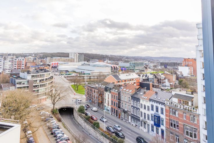 Idéalement situé en bord de Meuse, juste en face du port des yachts, dans un quartier calme, à quelques minutes à pied du centre de Liège, du Parc de la Boverie, du Ravel et du centre commercial Médiacité. Ce penthouse en excellent état situé au 9ème étage est UNIQUE en son genre et très lumineux. Il dispose d’une porte blindée, d’une salle à manger ouverte sur une cuisine super équipée (frigo américain, taque, hotte, four, micro-ondes, lave-vaisselle, meubles, évier), salon avec feu ouvert à bois, buanderie, d’un hall de nuit qui dessert une chambre de 4 x 3,40, wc séparé, salle de bains (baignoire, douche, meuble lavabo), une seconde chambre/bureau (3.1x2.8). Finitions haut de gamme :Nombreux placards, parquet en chêne, Airco, volet électrique à l’arrière, stores anti UV à l’avant, portes en verres, luminaires, châssis Alu DV, balcon qui fait tout le pourtour de l’appartement. En sous-sol : box fermé et cave privative. PEB : D – 259 Kwh/m².an .
