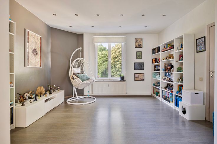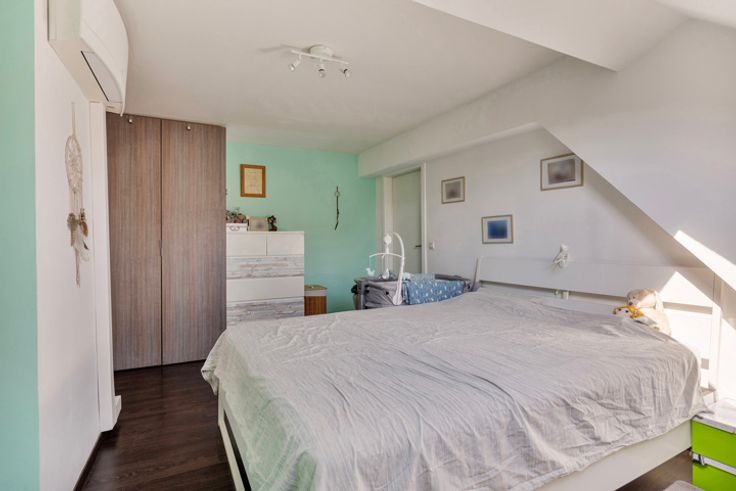 Op het tussenverdiep vindt u nog een apart toilet en een terras. De eerste verdieping bestaat uit een moderne open keuken en een leefruimte met een prachtig uitzicht op het park en de vijver van Wemmel, wat een gevoel van rust en ruimte biedt. De tweede verdieping biedt een volledig uitgeruste badkamer en twee ruime slaapkamers.