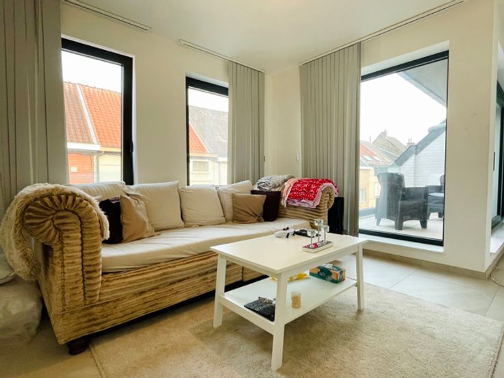 Dankzij de grote raampartijen in de leefruimte geniet het appartement van een enorme lichtinval. Via de leefruimte heeft men toegang tot het deels overdekte terras.