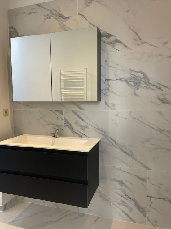 Er is een ruime moderne badkamer met inloopdouche, handdoek-droger, lavabo met mooi meubel.