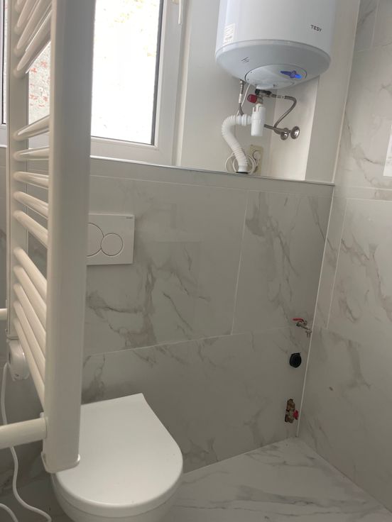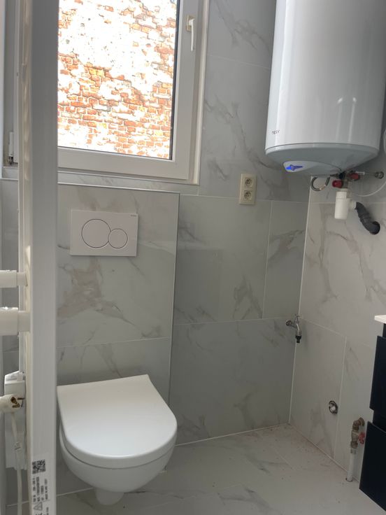 Een hangtoilet en aansluiting voor wasmachine en droogkast.
