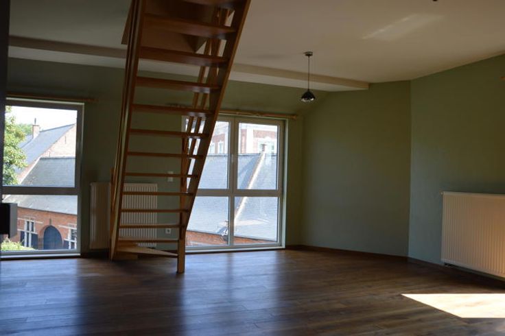 Bij het binnenkomen wordt u verwelkomd in een lichtrijke en sfeervolle leefruimte met een open keuken, volledig uitgerust met moderne toestellen. De stijlvolle trap naar de bovenverdieping is slim geïntegreerd in de woonkamer, wat een speels en open gevoel geeft aan de ruimte. Vanuit de leefruimte heeft u toegang tot een gezellig terrasje waar u in alle rust kunt genieten van het uitzicht over de stad.