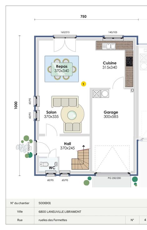 Celle-ci est composée d'un hall d'entrée, d'un WC, d'un séjour avec une cuisine équipée ( four, frigo, hotte, plaque vitrocéramique, lave-vaisselle ), un jardin avec terrasse, un garage buanderie, d'une salle de douches ( douche, meuble lavabo, WC ), et 3 chambres.