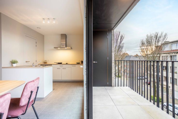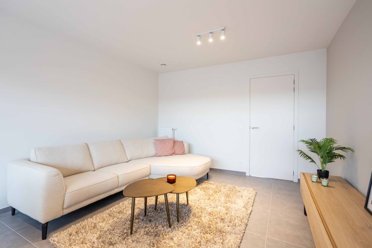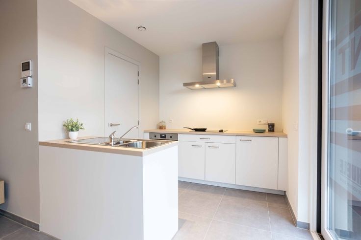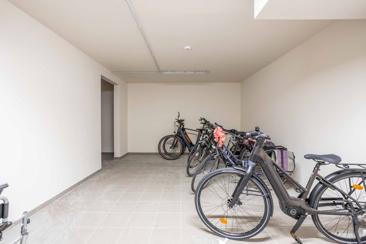 Een inkomhal, badkamer met inloopdouche, twee slaapkamers, een afzonderlijk toilet, ruime leefruimte met open keuken en een aansluitende technische berging. De keuken wordt geëquipeerd met alle nodige toestellen. De leefruimte heeft zeer veel lichtinval via het grote schuifraam die toegang geeft naar het terras (6m²). Er is in het gebouw ook een ruime fietsenberging voorzien.