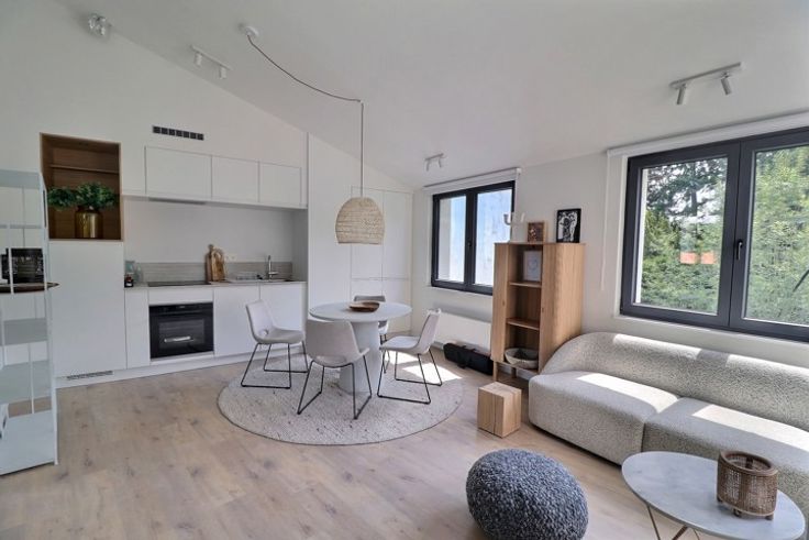 Gelegen aan de Chaussée de la Hulpe en vlakbij de vijvers van Boitsfort, dit gemeubeld appartement met één slaapkamer en een oppervlakte van ± 50 m² vis olledig ingericht in een jaren '70 geïnspireerde stijl. Het appartement geeft uit op een inkomhal met checkroom en gastentoilet, die leidt naar het woongedeelte bestaande uit een volledig uitgeruste keuken met centraal eiland, een eetkamer en een royale, volledig ingerichte woonkamer met toegang tot een heerlijk terras met uitzicht op de tuin. Aan de nachtzijde een grote slaapkamer met kleedkamer en aangrenzende doucheruimte, plus een tweede slaapkamer. Veel bergruimte en ingebouwde kasten maken deze woning compleet. Als je even wilt pauzeren, de benen wilt strekken of gewoon achterover wilt leunen en genieten van de tuin, zijn er een aantal woonruimtes beschikbaar op de eerste verdieping. Een gastenkamer met eigen badkamer met douche is beschikbaar voor vrienden of familie (EUR 30 per nacht). Overige: veiligheidsdeur, ingerichte wasruimte, individuele gasketel, nutsvoorzieningen: Communs (200,- EUR). PEB: B De Vijvers van Boitsfort is een rustige, groene buurt. Ideaal gelegen, biedt het een rustige ontsnapping aan de drukte van de stad, terwijl het toch dicht bij alle voorzieningen blijft.