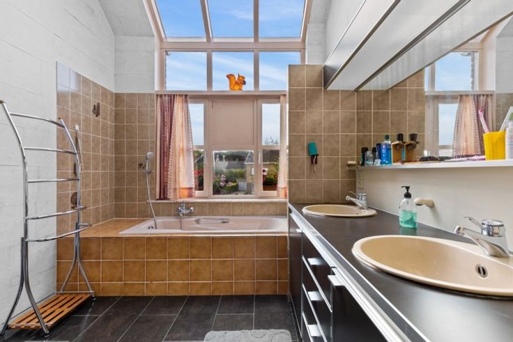 Eerste verdieping: Bureauruimte, twee royale slaapkamers (18 m² en 15 m²), en een lichtrijke badkamer met dubbele lavabo, opbergkasten, ligbad en douche.