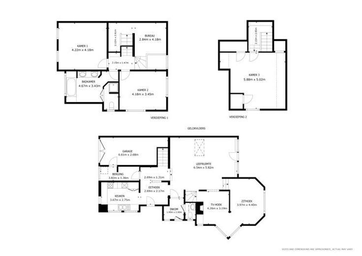 Gelijkvloers: Inkomhal met gastentoilet, ruime en lichtrijke leefruimte, zithoek met tuinzicht, knusse tv-hoek, volledig uitgeruste keuken met eethoek, praktische berging en ruime inpandige garage (18 m²).