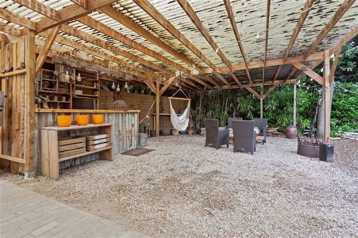 Tuin met terras, pergola, 2 vijvertjes en tuinberging.