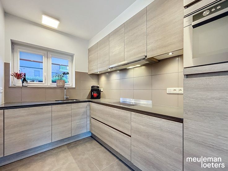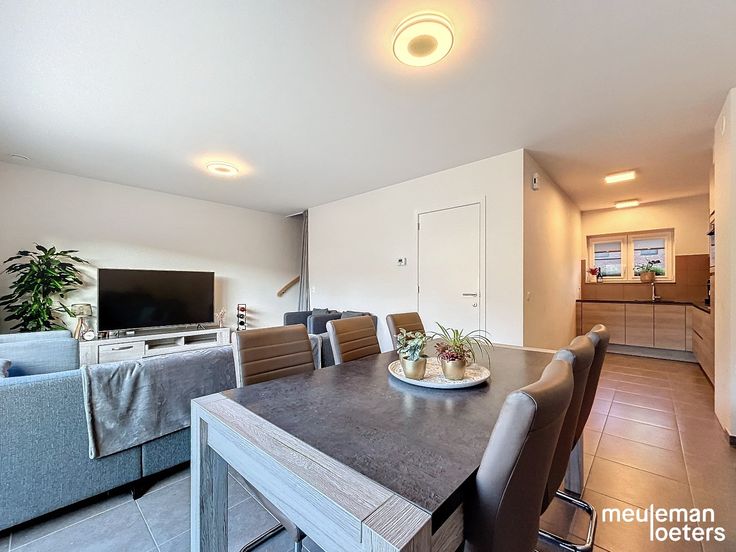 Een inkomhal met gastentoilet (inclusief lavabo), een ruime inpandige garage met automatische poort en thuisbatterij, een lichtrijke leefruimte en halfopen keuken (voorzien van inductiekookplaat, dampkap, combi-oven, koelkast, diepvries ,enkele spoelbak en vaatwasmachine).