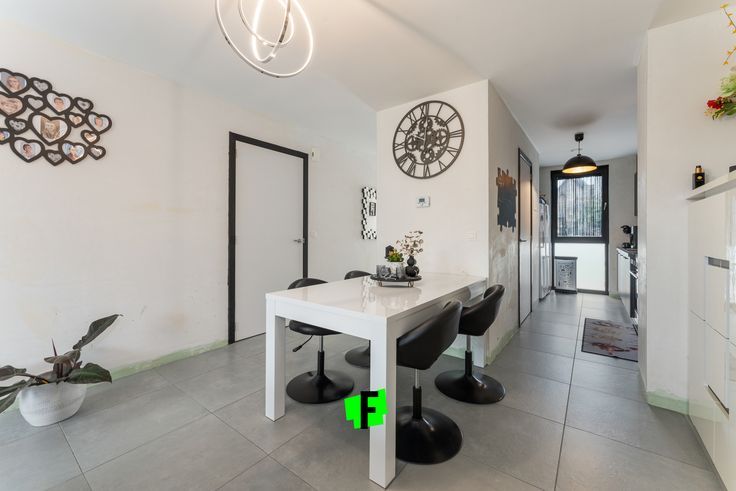 We komen via de inkom in de lichtrijke leefruimte, met aansluitend de keuken en een berging.
