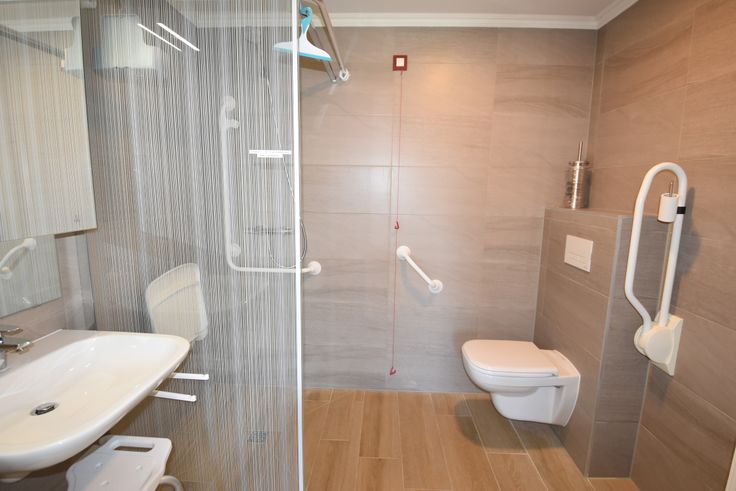 Ingerichte badkamer: ruime inloopdouche met klapstoel, toilet, lavabo, handdoekdroger