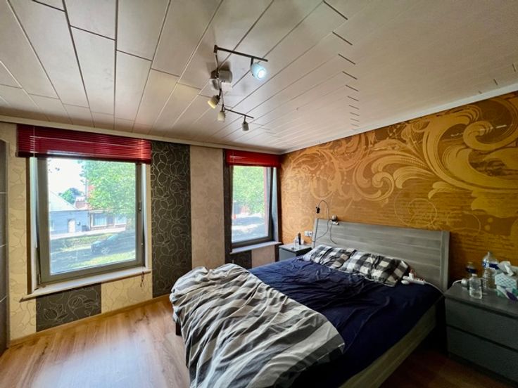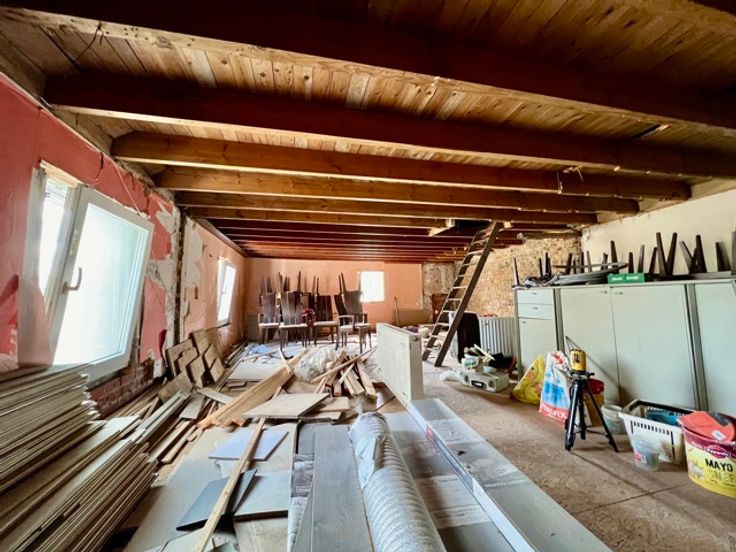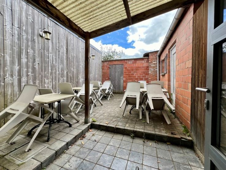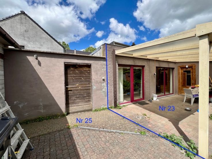 De naastgelegen woning wordt ook afzonderlijk verkocht (240 000€) en beschikt vooraan over een ruimte, die nu dienst doet als opslag , maar die kan ingericht worden als inkom. Er is een grote leefruimte met zicht op de achterliggende tuin en terras. Ook vanuit de keuken heb je toegang tot de tuin. Er is een grote bijkeuken, die kan ingericht worden naar eigen believen, zoals bv een ruim bureau of eventueel extra slaapkamer. Daarnaast is een badkamer met toilet, douche en lavabo.