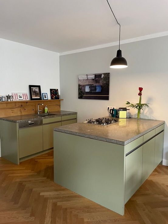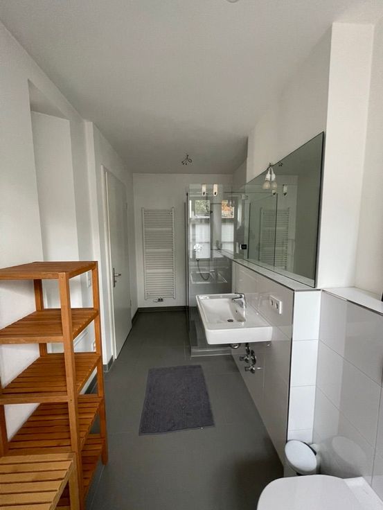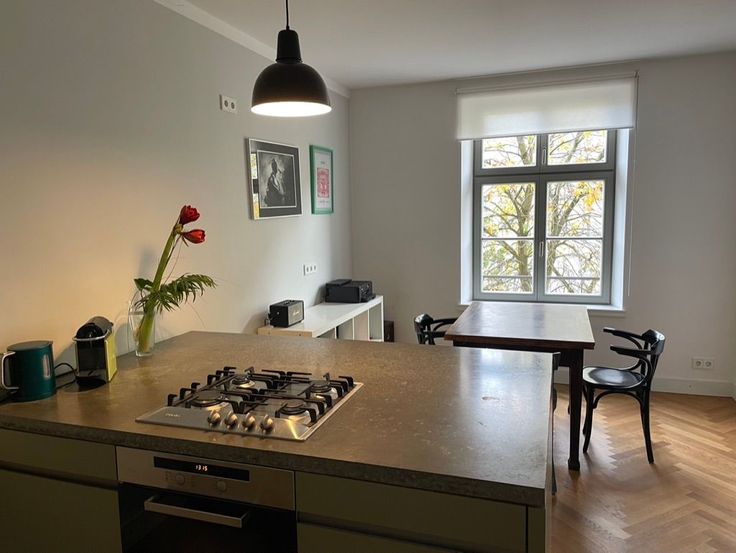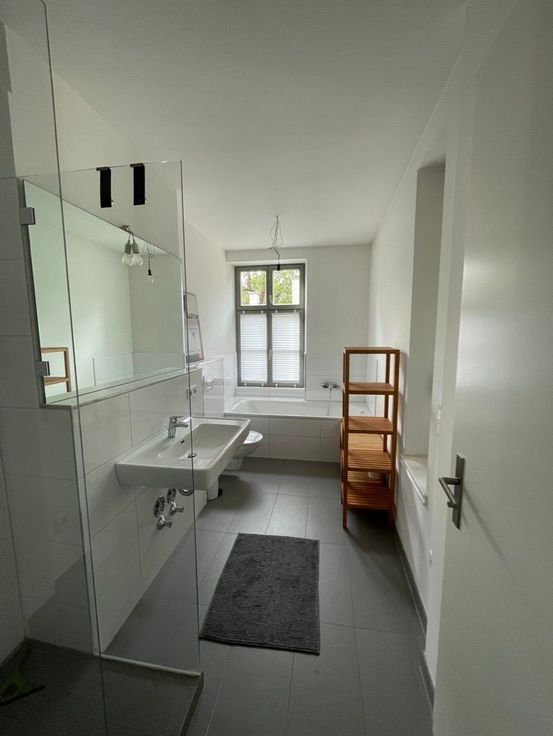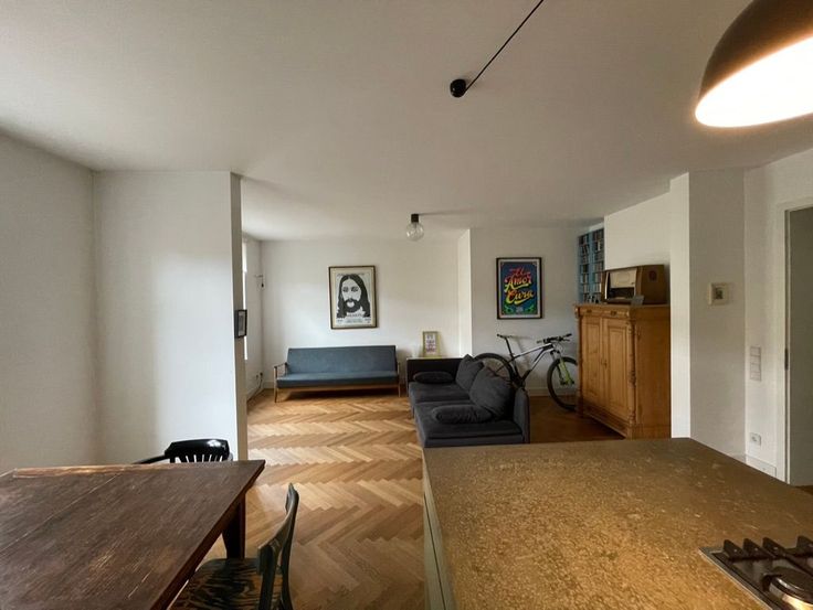 L'espace de vie de 70 m2 s'ouvre à droite. À gauche se trouve la cuisine ouverte avec des éléments élégants en bois et en béton, une cuisinière à gaz à 4 feux et des appareils électriques de première classe tels que lave-vaisselle, four et réfrigérateur. La salle à manger est située derrière l'îlot de cuisine, une table et des chaises en bois classiques vous invitent à dîner et à travailler. Sur le côté droit se trouve un salon confortable avec télévision à écran plat et 2 canapés où vous pourrez vous détendre. Les deux doubles fenêtres donnent sur la rue calme. Nous recherchons un locataire responsable, solvable et prudent qui utilisera et entretiendra l'appartement avec soin et attention.