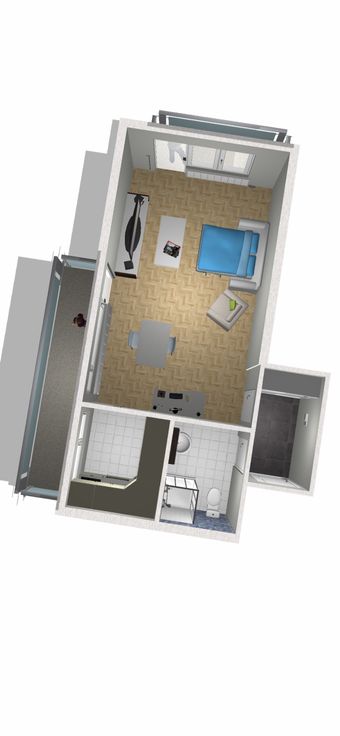 ce studio est composé d’un spacieux hall d’entrée carrelé avec un grand placard, d’un séjour lumineux de 24m² avec parquet massif en mosaïque donnant accès aux deux terrasses (7m² et 3m²) orientés Est et Nord , d’une cuisine équipée carrelé et d’une salle de bain carrelé avec cabine douche et wc.