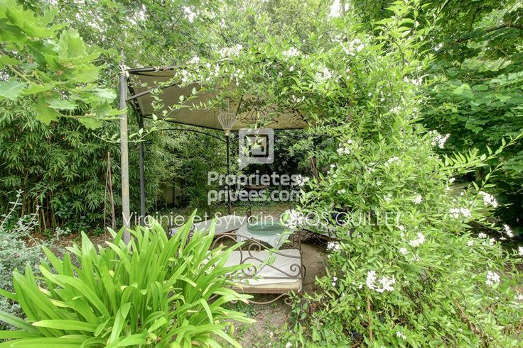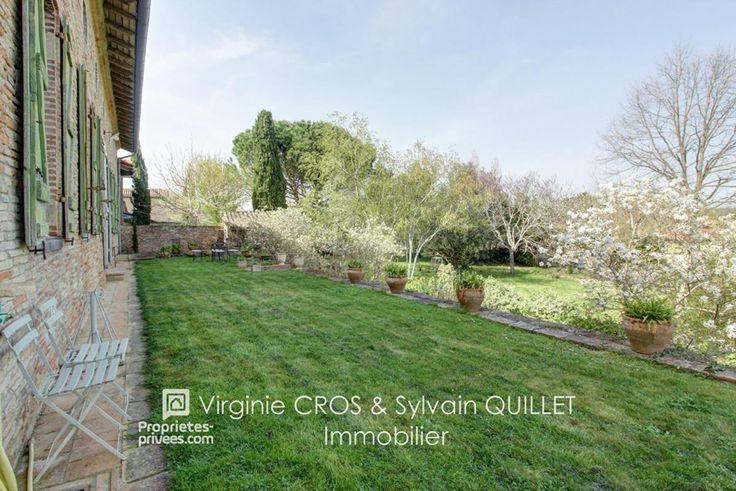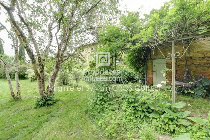 Une terrasse arrière surplombe un jardin clos et arboré,
