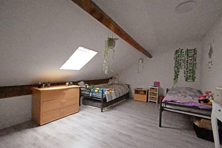 Elle se compose d'un grand living avec salle à manger, une cuisine entièrement équipée, une salle de bain (wc, baignoire et douche), accès vers le jardin; au 1er étage un hall de nuit avec deux chambres; au 2ème étage grenier aménagé en deux chambres supplémentaires et cave.