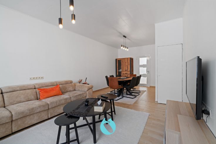 De inkomhal komt u terecht in de lichtrijke leefruimte. Aanpalend aan de leefruimte bevindt zich een ruime leefkeuken uitgerust met alle toestellen.