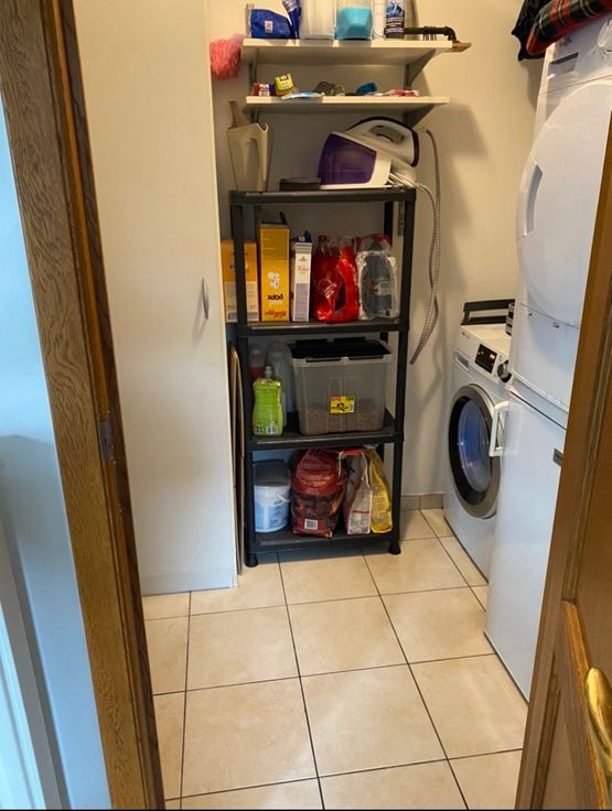 Salon et salle à manger ouverte sur la cuisine, buanderie, une chambre, une SDB et un WC.