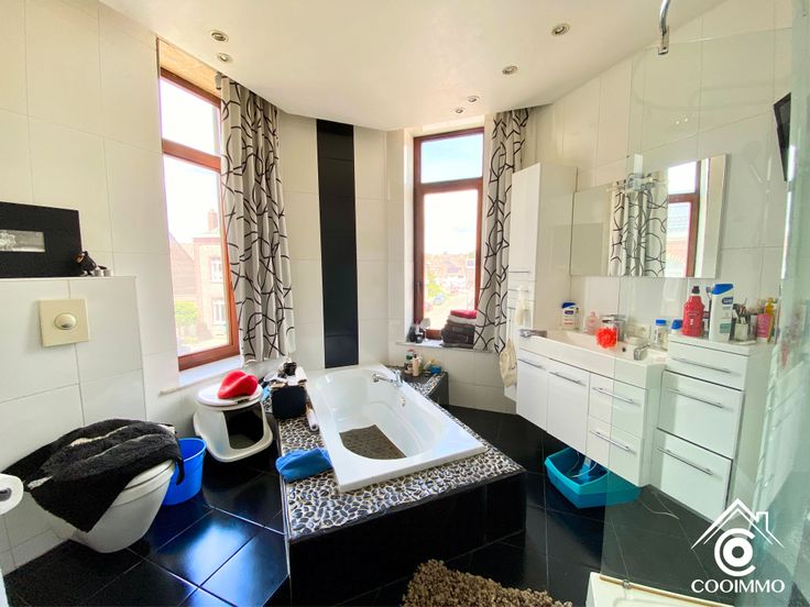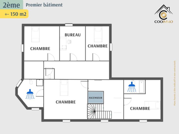 2ème: Un hall, une toilette, deux chambres de +- 20 et 25m2 avec chacune une salle d’eau. Pour finir, trois pièces de +-11, 12 et 17m2 pour usage divers selon vos besoins (chambres, bureau, salle de jeux, …)