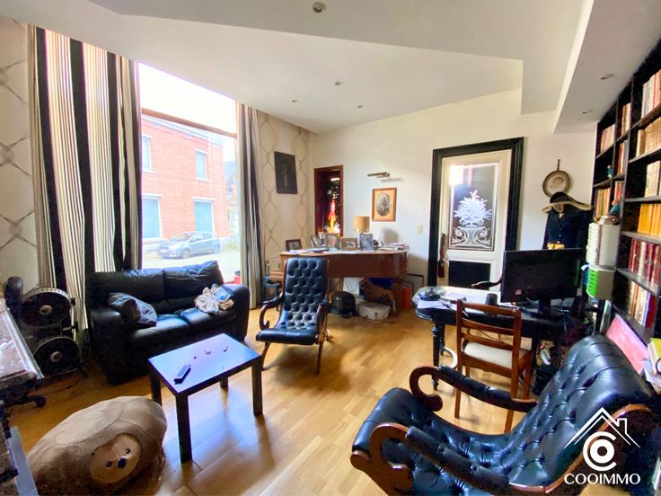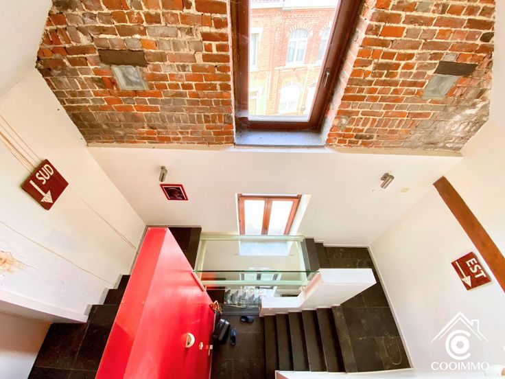 RDC: Une entrée indépendante, un vaste séjour de +- 30m2, un bureau de +- 25m2, une chambre avec WC et SDB, un hall vers l’extérieur, une cuisine avec accès vers l’extérieur. Une seconde entrée indépendante avec un hall donnant sur la cage d’escal.