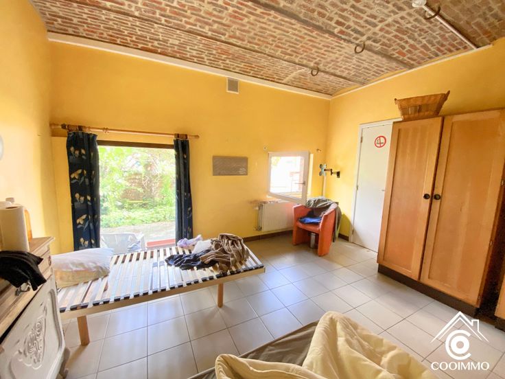RDC: Une entrée, un vaste séjour, une SàM de +- 25m2, une buanderie, une cuisine et une chambre de +- 18m2 avec une salle d’eau.