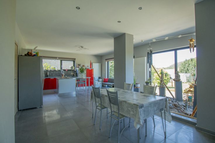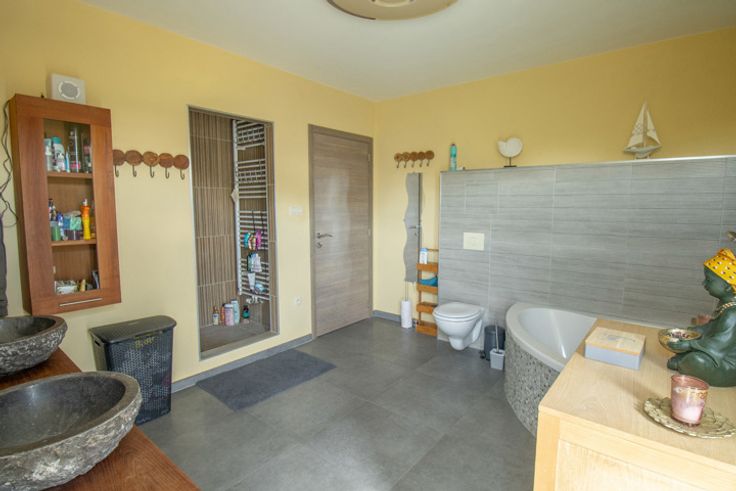 Au rez-de-chaussée, un agréable hall d'entrée très lumineux vous accueille, un bureau, un très grand séjour (salon - salle à manger), une vaste cuine équipée (four - taque - hotte - frigo - lave-vaisselle), un wc séparé et une première buanderie.