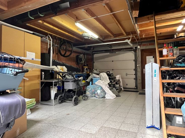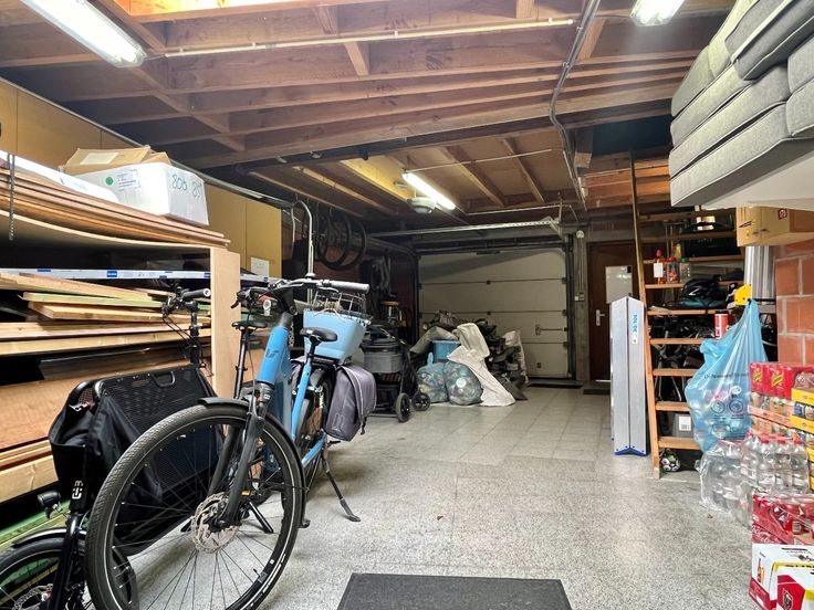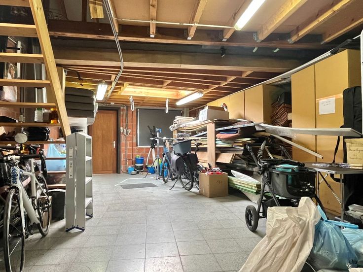 Achteraan de woning staat een magazijn met voldoende plaats voor twee auto's om achter elkaar te parkeren. Dit magazijn beschikt ook over een zolderverdieping. De woning heeft een uitweg naar de achterkant, waar je gratis kunt parkeren.