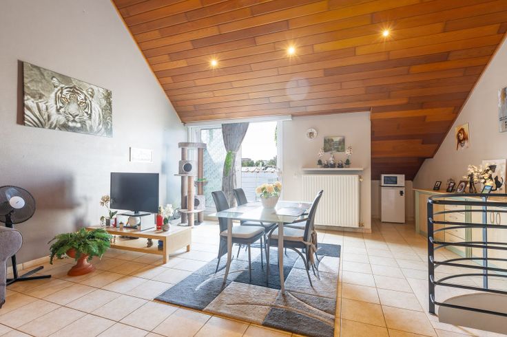 Duplex 99m2: inkomhal, afzonderlijk toilet, badkamer, twee ruime slaapkamers, trap naar boven, gezellige woonkamer met ingerichte keuken en eetplaats, toegang tot zonnig terras.