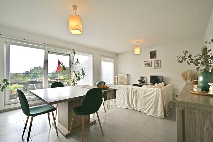 Celui-ci se compose d'un vaste et lumineux séjour donnant accès à une grande terrasse, d'un coin cuisine équipée (four, taque, hotte, frigo), de deux chambres, d'une salle de douche, d'une buanderie et d'un WC séparé.