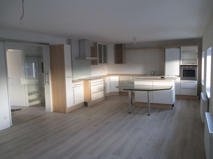 Salon-salle à manger avec cuisine équipée ilôt moderne et table à manger intégrée