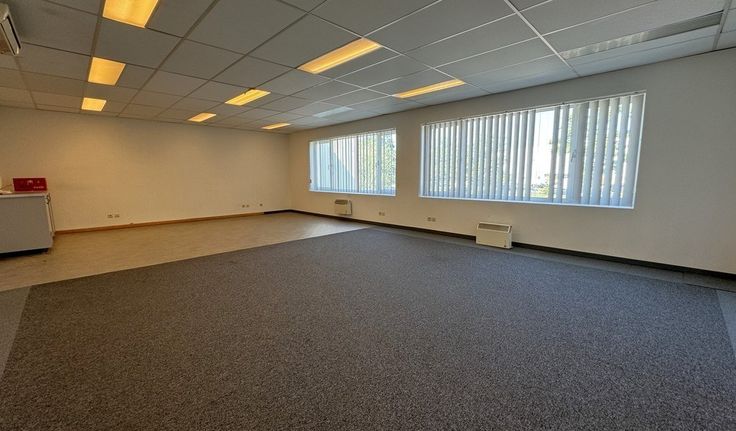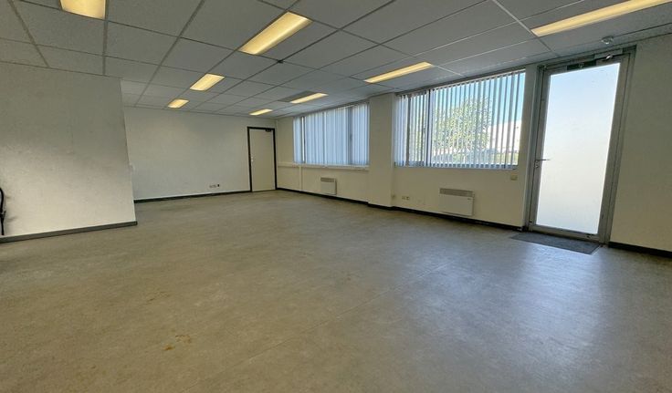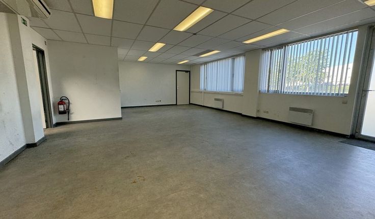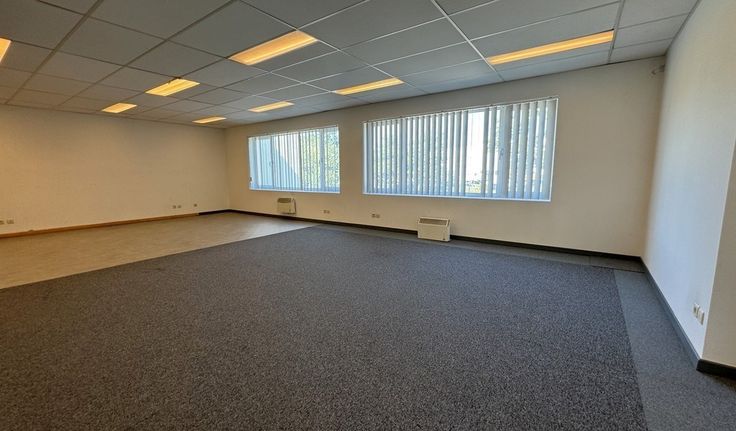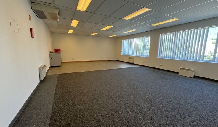 Specificaties kantoor: landscape ruimte (2 x 65m²), verlaagd plafond met inbouw led-armaturen, wandkabelgoten, tapijttegels en linoleum vloerbekleding, elektrische verwarming en airco, privatief sanitair