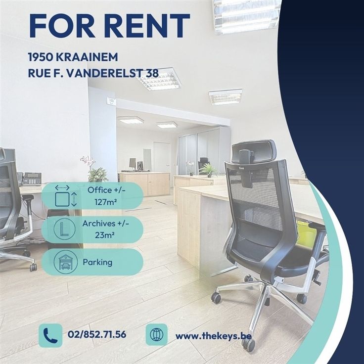 EXCLUSIVITEIT THE KEYS - KRAAINEM / Stockel - Onmiddellijk beschikbaar - Op de grens tussen Kraainem en Sint-Pieters-Woluwe, op het gelijkvloers van een kleine residentie in de onmiddellijke nabijheid van het Dumonplein, Stockel Shopping en de metro, wordt u een prachtige KANTOOR-ruimte van +/- 150m² aangeboden. Op het gelijkvloers vindt u het hoofdkantoor van +/- 60m², een KEUKEN van +/- 8m² en een WC. Een deur aan de achterzijde geeft toegang tot de parkeerplaats, waar een PARKEERPLAATS is inbegrepen in de huurprijs. In de kelder is er een volledig uitgeruste ruimte die gebruikt kan worden als VERGADERRUIMTE van +/- 40m², plus een archiefruimte (met rekken) van +/- 22,5m² en een serverruimte van +/- 8m². Een tweede KEUKENETTE met WC bevindt zich ook op dit niveau. De gehele ruimte is momenteel gemeubileerd, inclusief bureaus, opbergkasten, stoelen en alle IT-apparatuur voor onmiddellijk gebruik. Het is ook mogelijk om het ongemeubileerd te huren, afhankelijk van je wensen. De porivisie voor maandelijkse lasten is €250, waarin alle gemeenschappelijke kosten en het verbruik van koud water zijn inbegrepen. Daarnaast moet je €200 per maand aan onroerendgoedbelasting betalen.