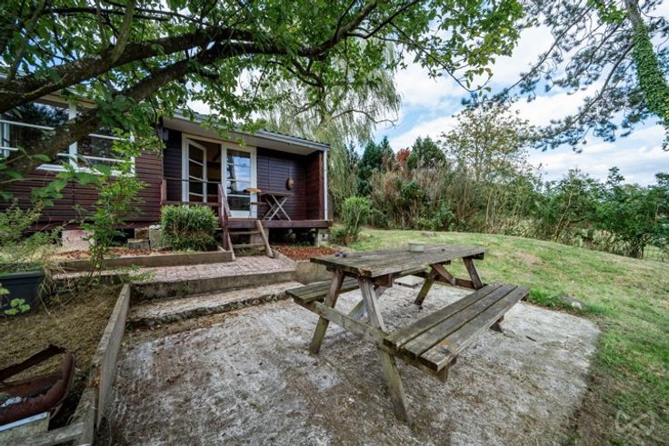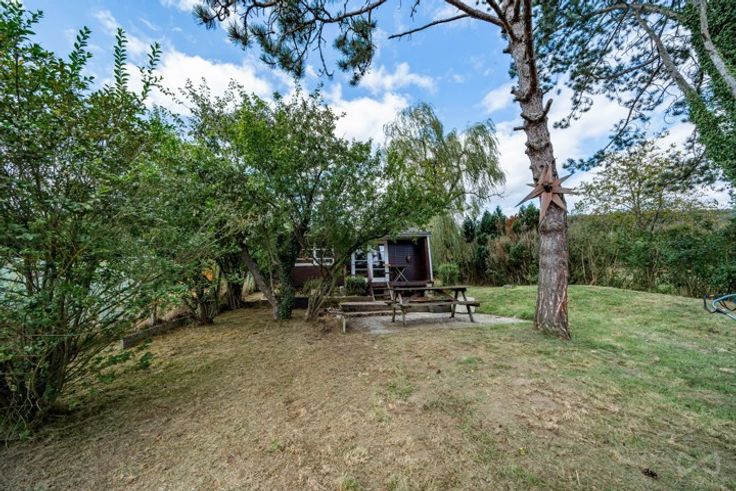 Charmant chalet 4 façades, une chambre, salle de douche, kitchenette et un garage idéalement situé sur un terrain de près de 12ares à Treignes, entité de Viroinval. Certificat PEB non requis (superficie utile totale