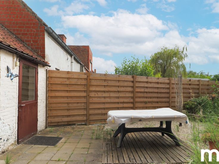De tuin is aangelegd met een terras in hout, uitweg achteraan.
