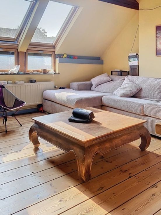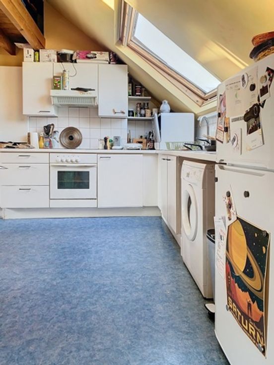 Situation idéale, appartement lumineux situé au dernier étage d'une petite copropriété se composant comme suit : hall d'entrée, grand séjour avec cuisine ouverte équipée, une chambre, une salle de bain et une toilette séparée. Bureau en mezzanine. Chaudière individuelle au gaz récente. Electricité conforme. PEB en cours.. A voir!! Infos et visite au 02/521.21.22