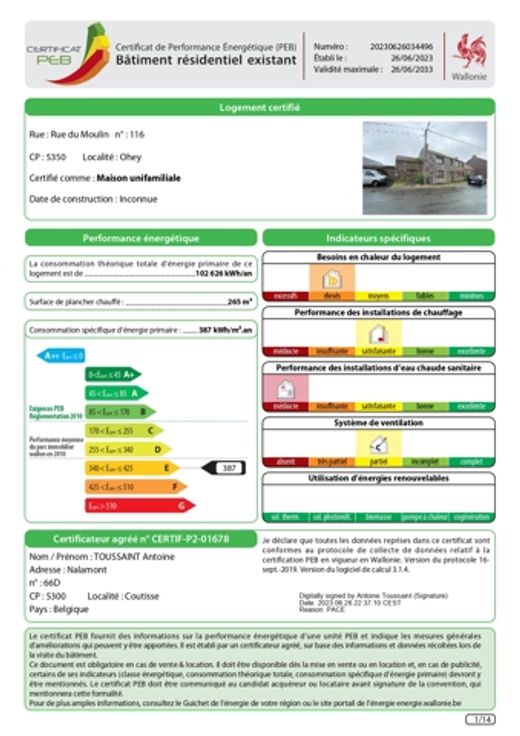 PEB : E n°20230626034496 – 387 kWh/m².an – 102 626 kWh/an