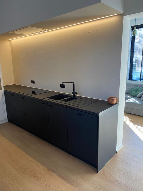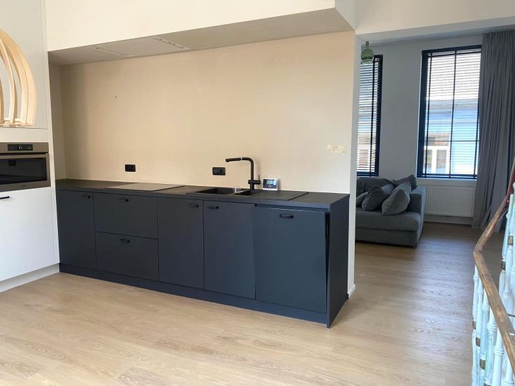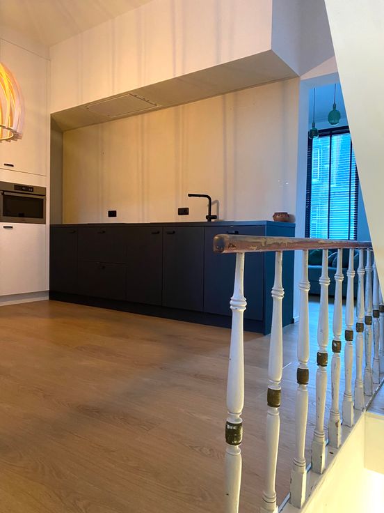 Geïnstalleerde keuken met leefruimte , aparte berging en aanpalende ruime living.