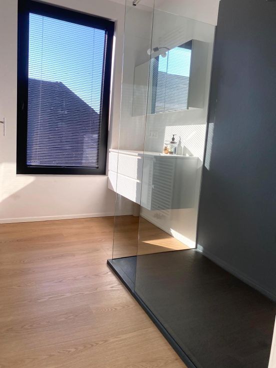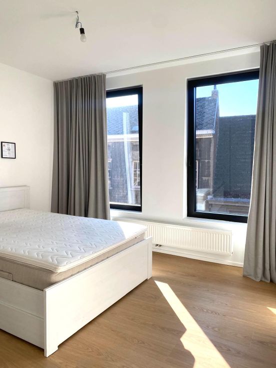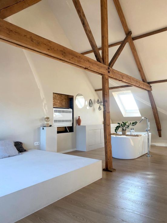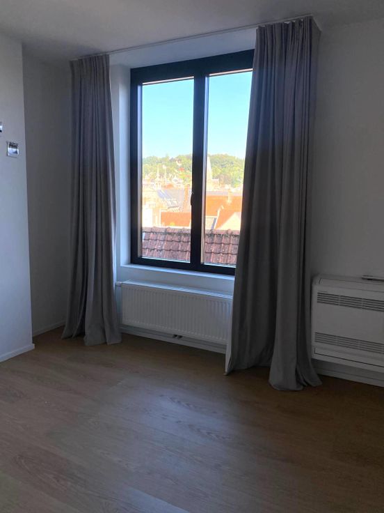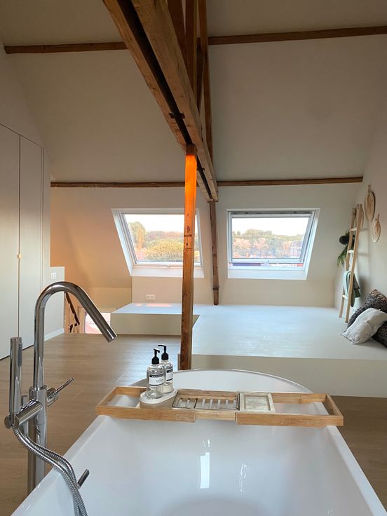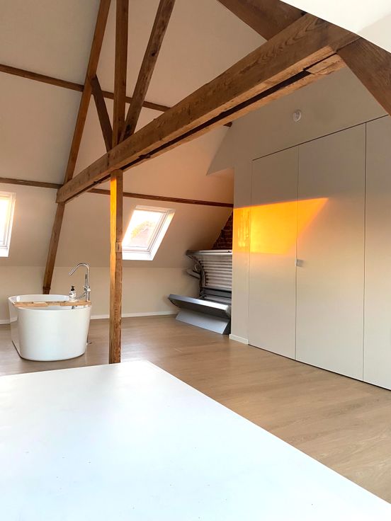 Met zicht op de Markt van Geraardsbergen werd hier een loft gecreëerd voorzien van een tweede badkamer met een ligbad centraal in de ruimte.