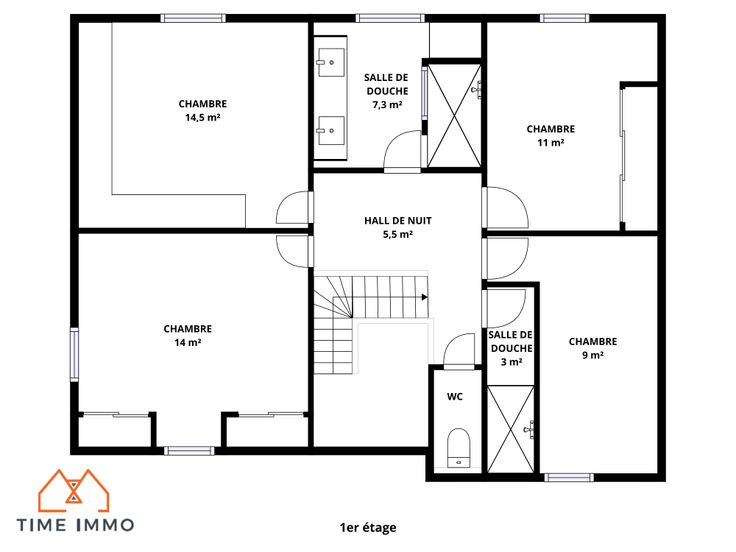 1er étage : Un hall de nuit desservant 4 belles chambres, 2 salles de douche, un WC séparé.