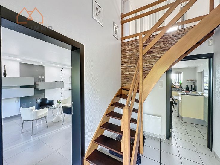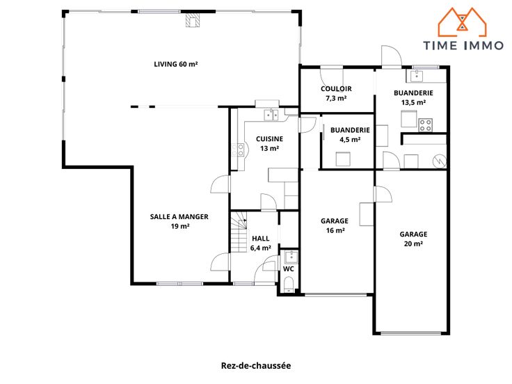 Rez-de-chaussée : Un hall d'entrée, un magnifique living bondé de lumière grâce à toutes ses baies-vitrées, une salle à manger ouverte sur le living, une cuisine avec ouverture sur le living, un couloir, 2 buanderies, 2 garages, un WC séparé.