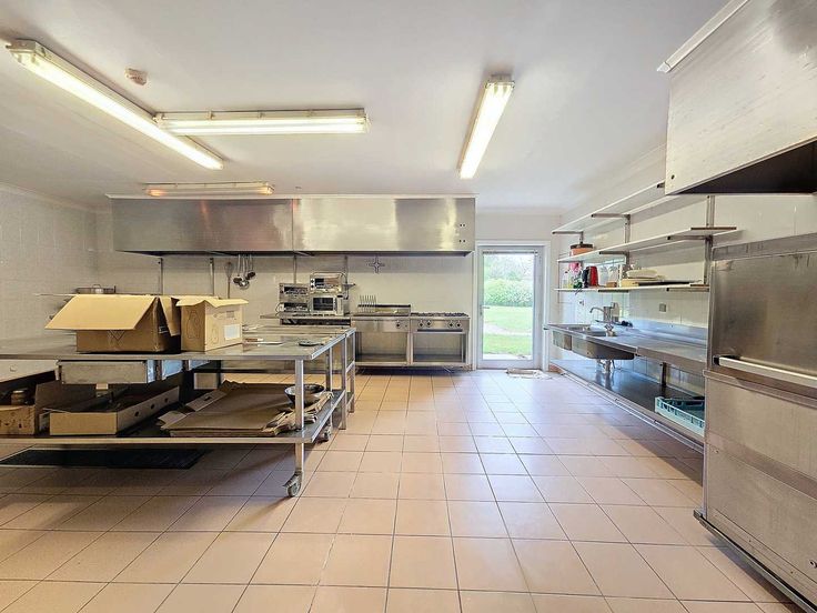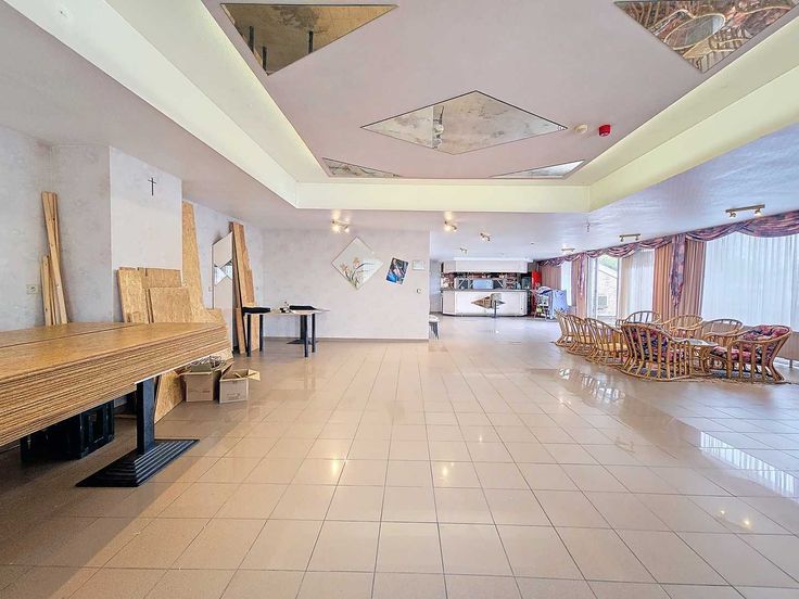 Indeling van het pand: 2 grote zalen, keuken en bijkeuken, opslagruimte, een garage en ruime parking met diverse parkeermogelijkheid.