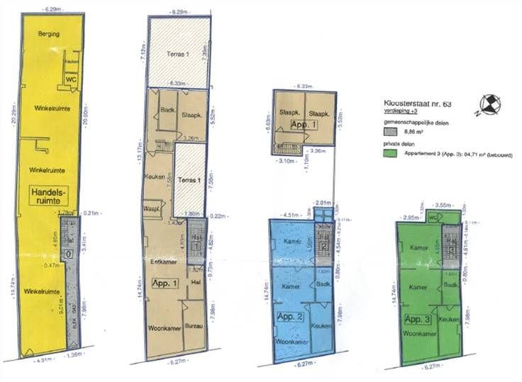 Het betreft handelsgelijkvloers (197m² + kelder) (EPC B) / Duplex 3-SLK (177m², 1e + 2e verd. + terrassen) (EPC D) / 2-SLK (83m², 2e verd.) (EPC B) / 2-SLK (83m², 3e verd.) (EPC B).