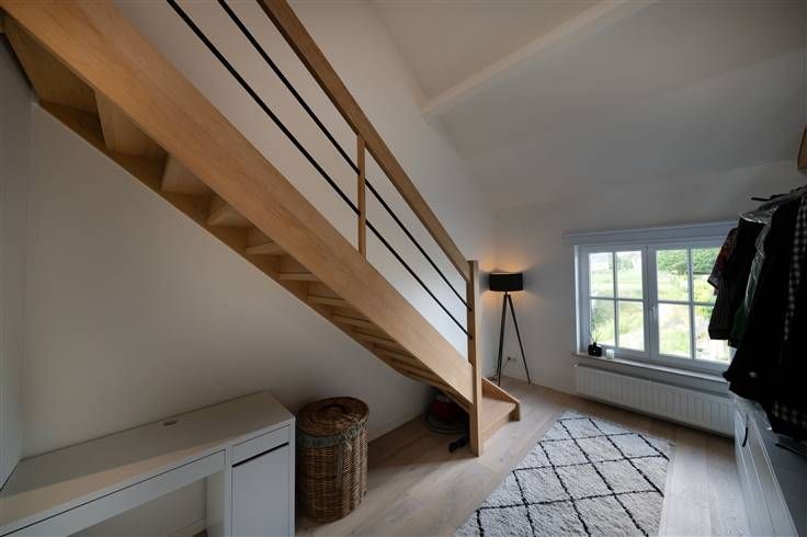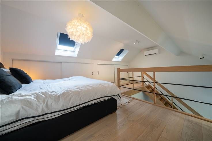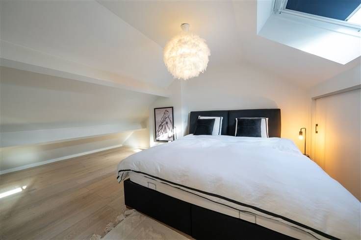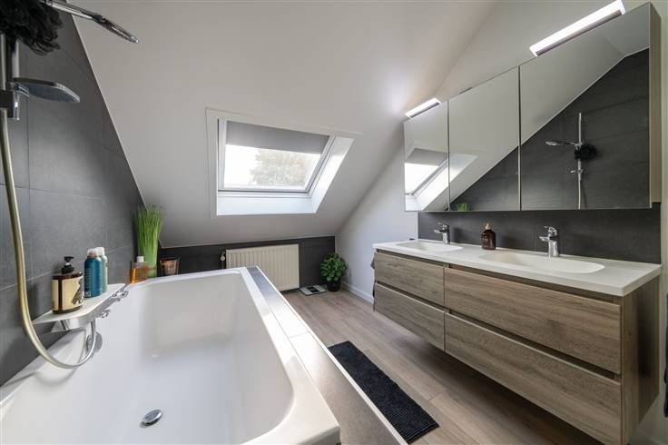 Tweede verdieping (62m2): traphall (2m20x2m45), slaapkamer 1 (3m75x3m50), slaapkamer 2 (3m00x3m20), slaapkamer 3 of bureel (2m85x4m40) met trap naar de zolderverdieping, badkamer (2m20x4m55) met ligbad, meubel met 2 wastafels en WC