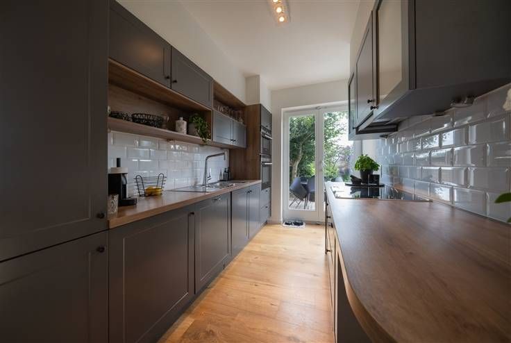 Eerste verdieping (67m2): traphall (2m45x2m20), knappe leefruimte (43m2) toegang gevend tot de tuin, open, volledig ingerichte keuken (2m15x4m55), terras en ZW-gerichte tuin