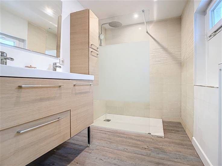 Au rez-de-chaussée, vous trouverez : un hall d’entrée avec vestiaire, un vaste living combinant salon et coin repas, une cuisine entièrement équipée, un espace pour machine à laver, un WC indépendant et une salle de bains dotée d'une douche italienne.