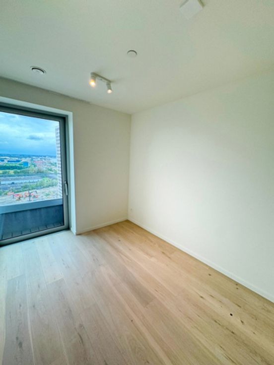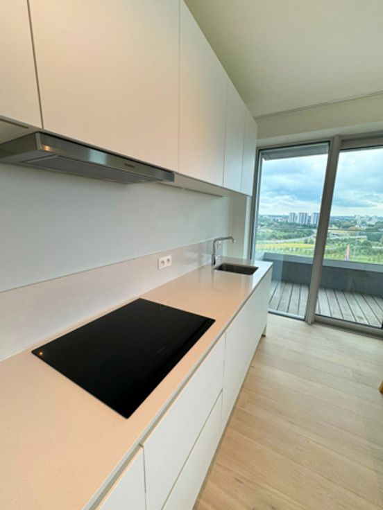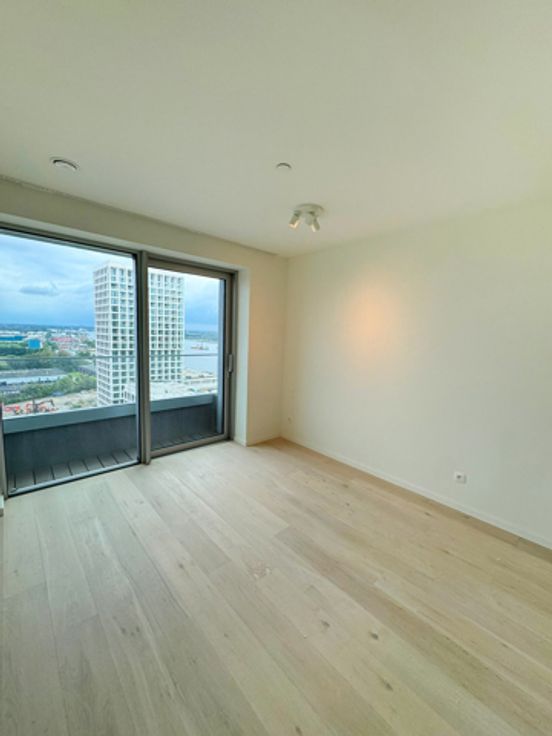 Het gerenommeerde DRDH Architects, dat een rits aan internationale awards wegkaapte, liet zich voor hun ontwerp aan ZICHT leiden door de omgeving en het uitzicht. Het resultaat is een unieke architectuur, met een gebouw dat het licht lijkt te vervangen en te weerkaatsen. ZICHT heeft een sterke urban uitstraling, maar is ook kalm en sereen, met kleurschakeringen die veranderen met het weer, waardoor de toren haast deel uitmaakt van de lucht. Het appartement is gelegen op de 16de verdieping van het gebouw en geniet van een prachtig uitzicht. De leefruimte is volledig open en geeft toegang tot het terras. Op het terras is er verlichting en elektriciteit voorzien. De leefruimte geniet van verschillende ramen tot op de grond dat zorgt voor een prachtig uitzicht over de stad en zeer veel lichtinval. De keuken is volledig geïnstalleerd met de nieuwste toestellen. Er is een aparte berging met aansluiting voor wasmachine en droogkast. Verder is er een grote slaapkamer en een 2de slaapkamer/bureau/dressing. Een badkamer met inloopdouche, en een apart toilet. Provisie voor gemeenschappelijke lasten, warm water en verwarming is 175€/maand. Mogelijkheid tot het huren van een parkeerplaats in het gebouw tegen 135€/maand.