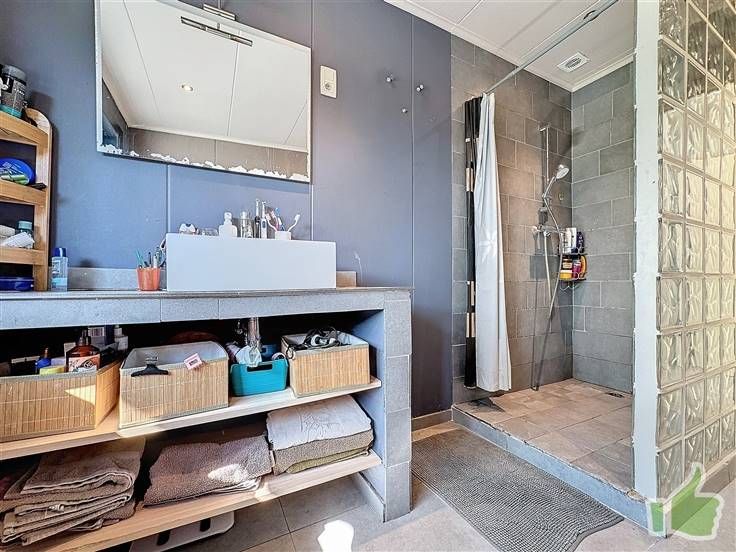 Dès l'entrée, vous serez séduit par ses volumes généreux et sa luminosité. Le rez-de-chaussée comprend un hall avec escalier apparent, un living ouvert regroupant un salon avec feu au bois, une salle à manger et une cuisine équipée. On y trouve aussi un cellier, des toilettes et une salle de bain.