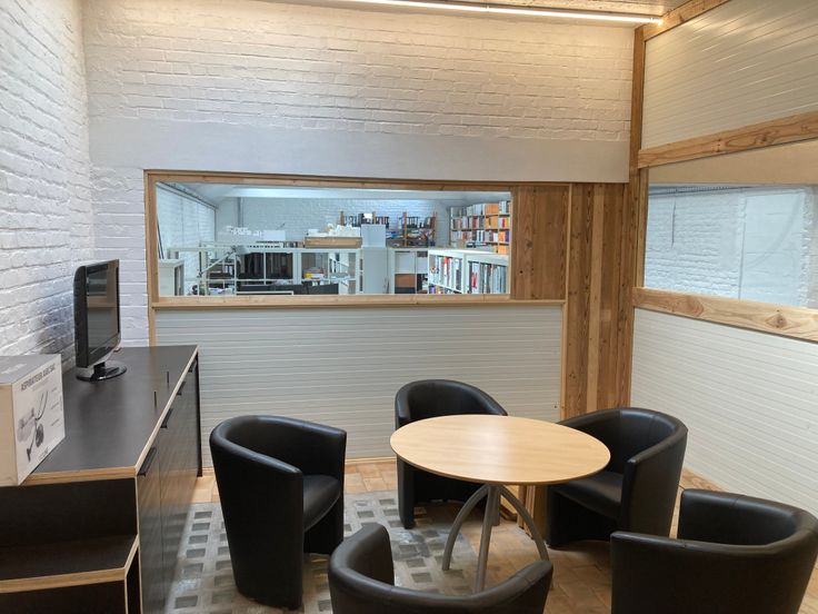 Photos prises avant/après pose de la cloison de la salle de réunion.