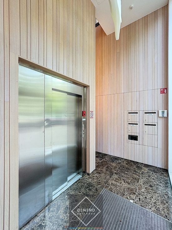 Gelijkvloers: gemeenschappelijke inkomhal met personenlift en traphal.